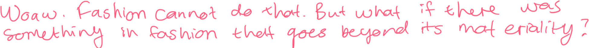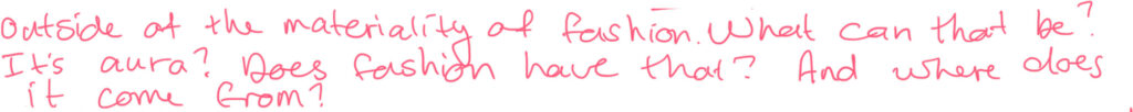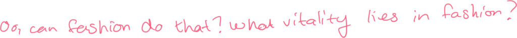 Outside of the materiality of fashion. What can that be? Fashion’s vitality? Does fashion have that? And where does it come from [insert sinister manufacturing process]?