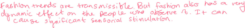 Fashion trends are transmissible. But fashion also has a very dynamic effect on the people who observe it. It can cause significant sensorial stimulation.