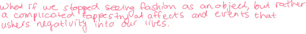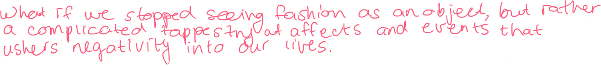 What if we stopped seeing fashion as objects but rather a complicated tapestry of affects and events that ushers negativity into our lives.