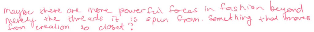 Maybe there are more powerful forces in fashion beyond merely the threads it is spun from. Something that moves from creation to closet?