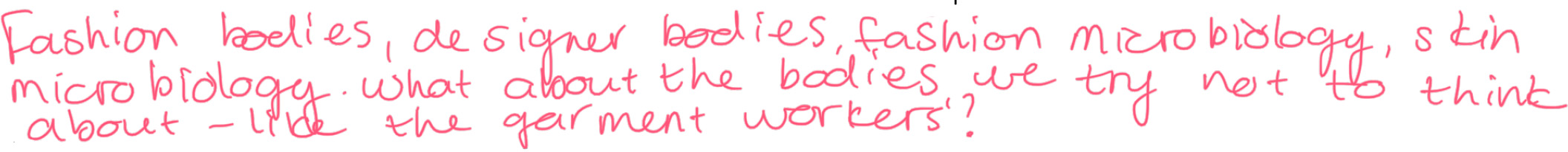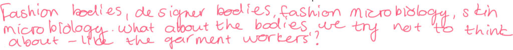 Fashion bodies, designer bodies, fashion microbiology, skin microbiology. What about the bodies we try to not think about, like the garment workers’?