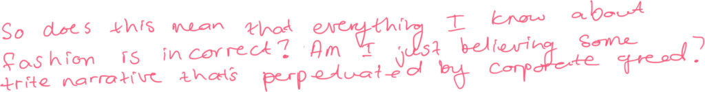So does this mean that everything I know about fashion is incorrect? Am I just believing some trite narrative that’s perpetuated by corporate greed?