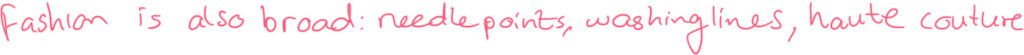 Fashion is also broad: washing lines, needlepoints, haute couture.