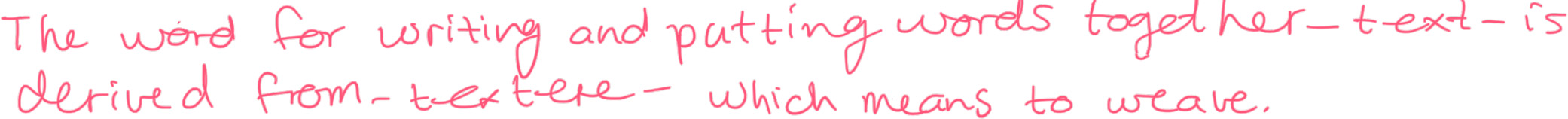 The word for writing and putting words together – text – is derived from textere: which means to weave. Text is also the root word for textile, a term that predates the usage of text.